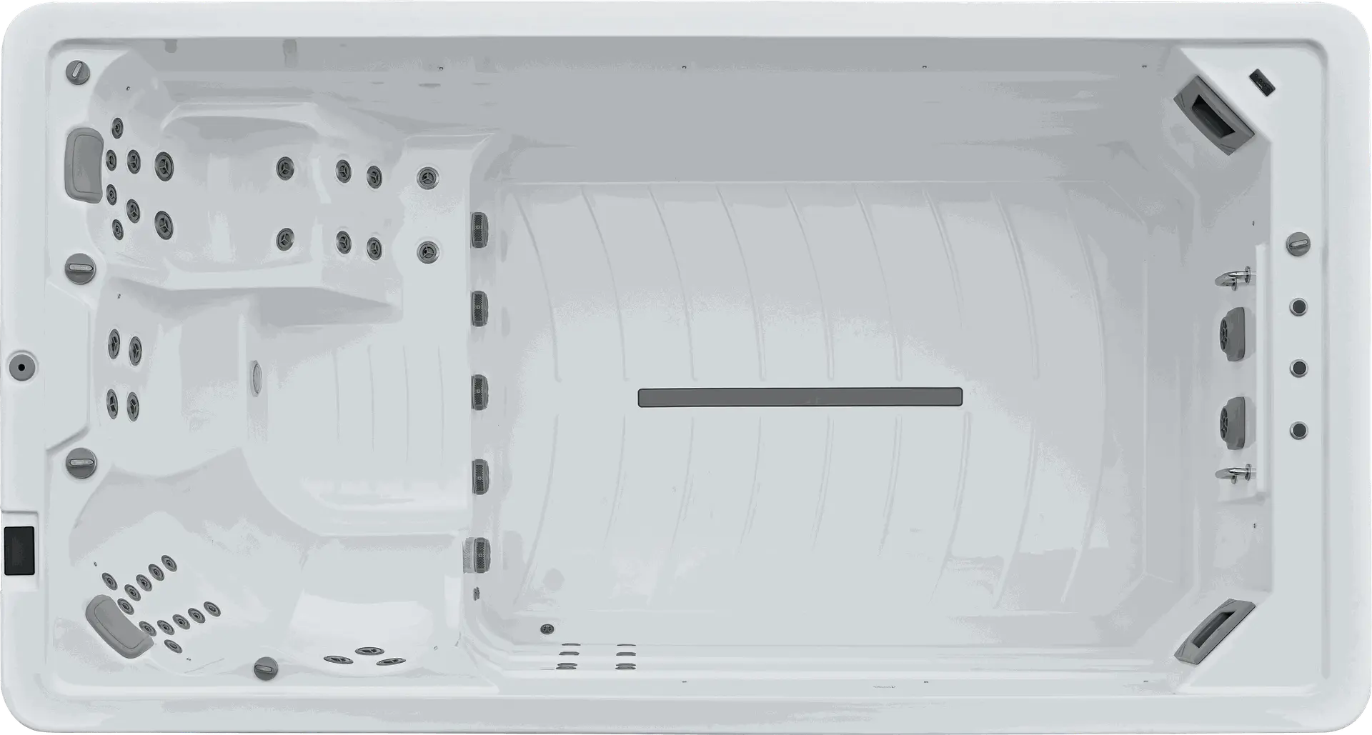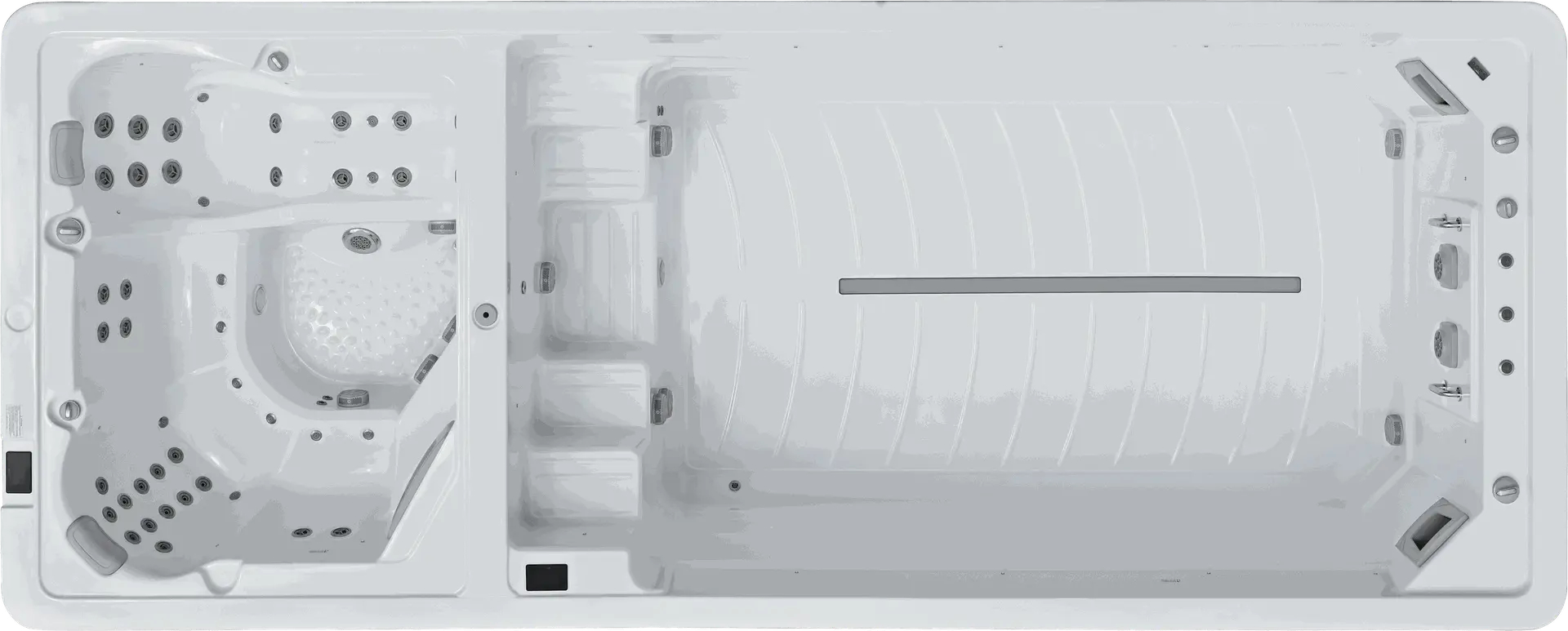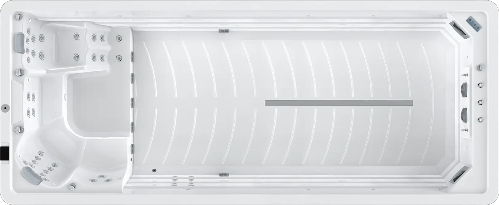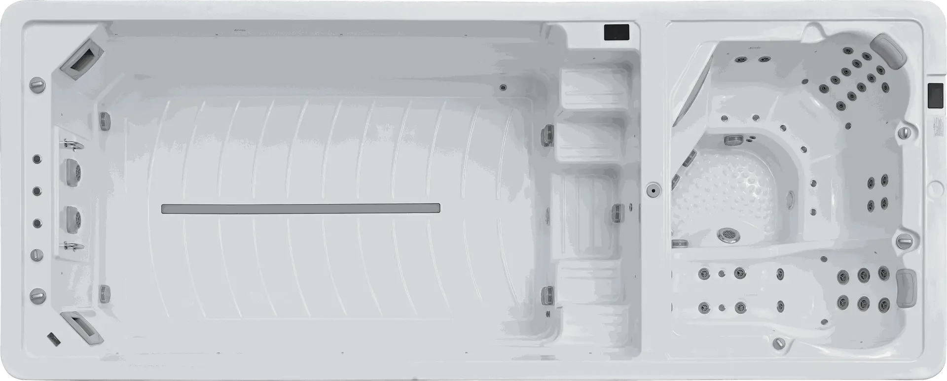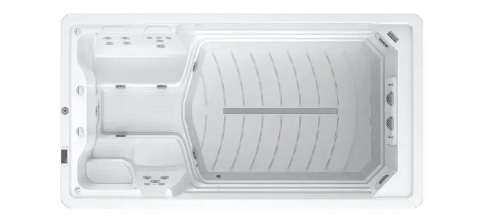 Getrennt und doch vereint, die Lösung wenn man beides möchte. Im Whirlpool Relaxen auf 3 Massagesitzen und einer Massageliege und im Swimmingpool sportlich aktiv schwimmen mit einer Gegenstromanlage. Mit einer Gesamtlänge von fast 8m und einer Gesamttiefe von 1,5m unser größter Swimspa der keinen Wunsch unerfüllt lässt.